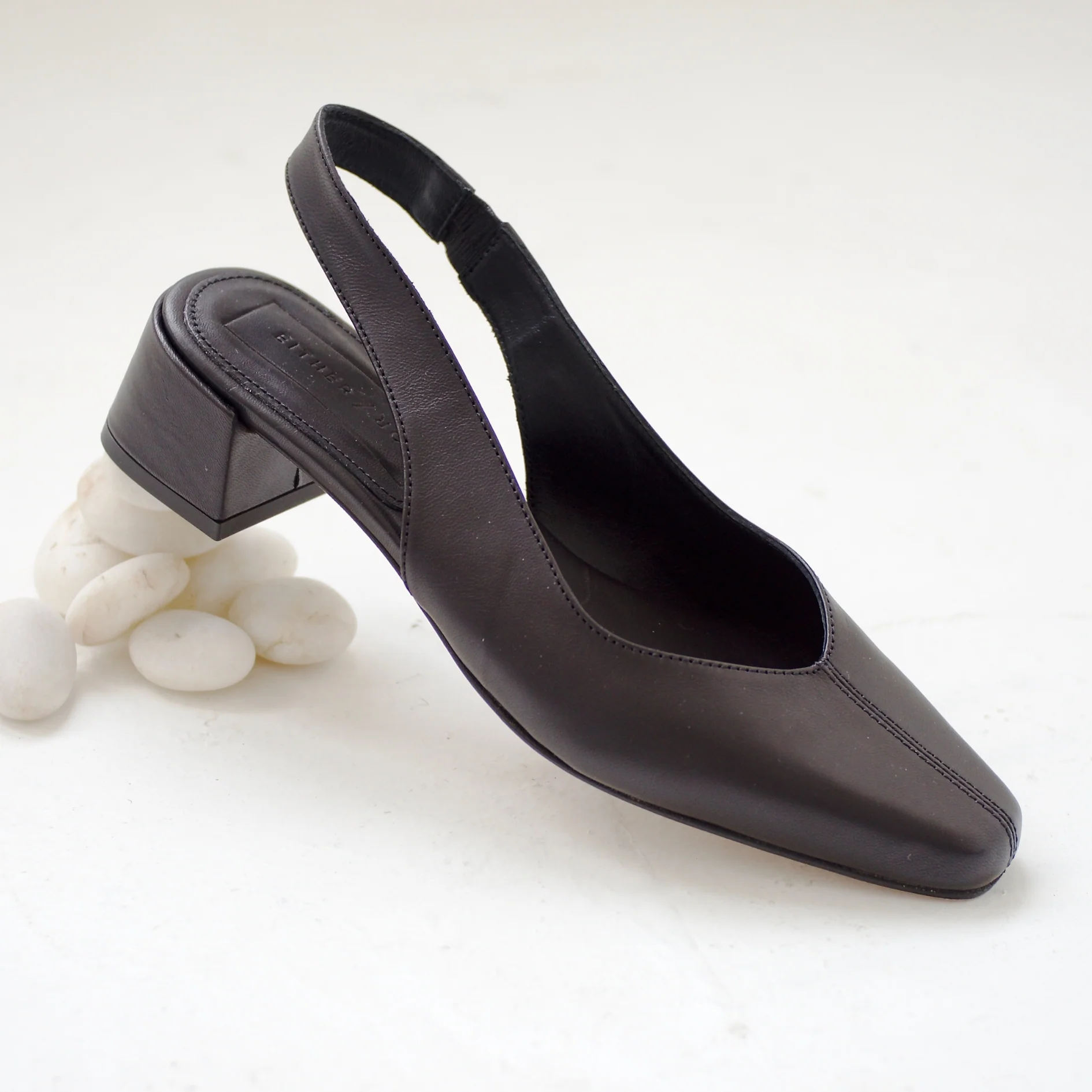 This leather slingback features a softly snipped toe and a low block heel for everyday wear. Minimal and sophisticated. Made using the same last as our bestselling Heeled Ballet pump. Styled with our Knee High Sock.
